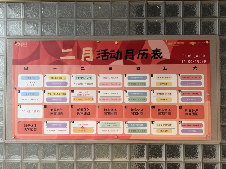 杭州银发西溪Mall在市集门口张贴着每月动作表。吕倩雯 摄