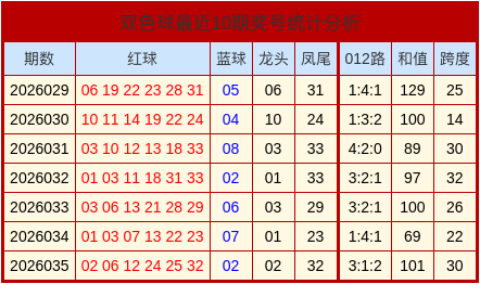 上期双色球的开奖号码中,和值为101,跨度为30,012路比为3:1:2。