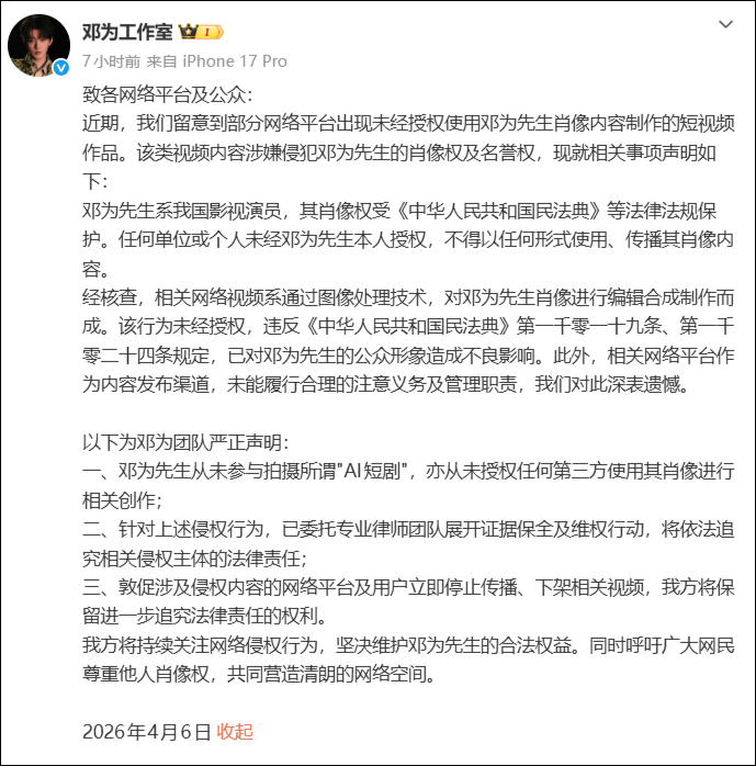 近日,AI侵权问题激发暖热,多位艺东说念主使命室发布短剧侵权声明。