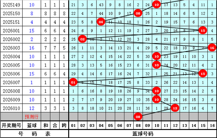 第五位红球:上期开出1路号码:19,下降4个点位,本期预计1路号码再出,推荐号码16;