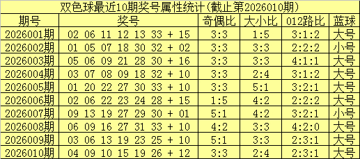 双色球第2026010期开奖号码:04 09 10 15 19 26 + 12。红球大小比为2:4,奇偶比为3:3,012路比为2:3:1,蓝球为大号。