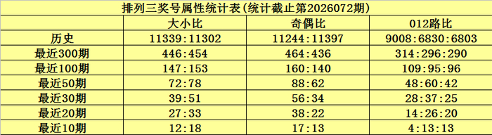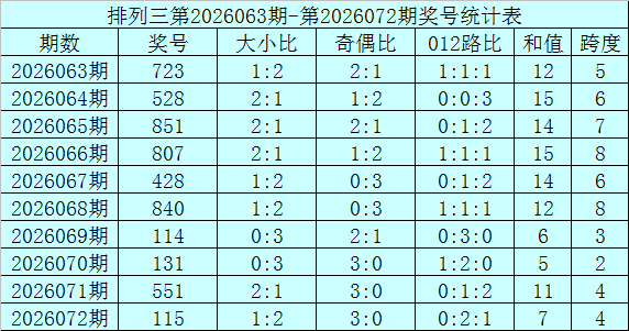 上期总结:成列三第2026072期奖号为115,奖号012路比为0:2:1,奇偶比为3:0,大小比为1:2,和值为7,跨度为4。