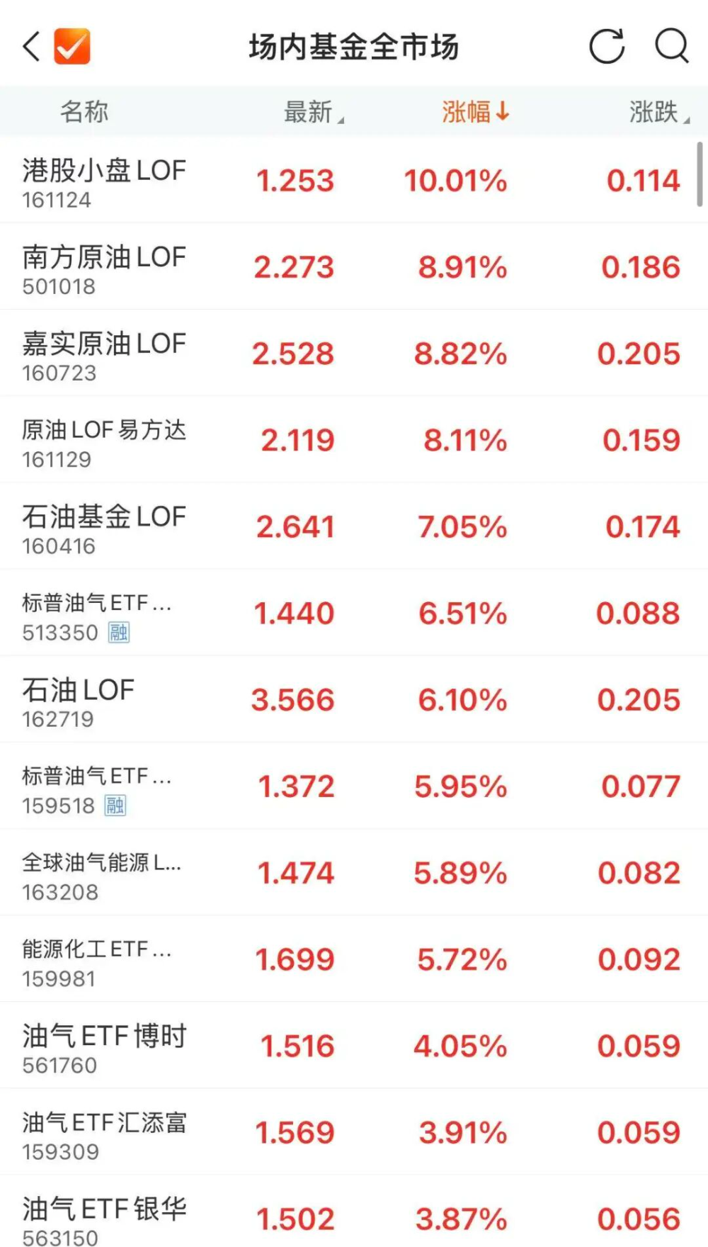 受油价飞腾影响,原油、油气类LOF及ETF领涨场内基金。南边原油LOF、嘉实原油LOF、易方达原油LOF等盘中一度涨幅着手9%,戒指收盘有所回落,嘉实原油LOF、南边原油LOF、易方达原油LOF涨超8%。部分居品当日换手率着手500%,如石油LOF、人人油气动力LOF等。