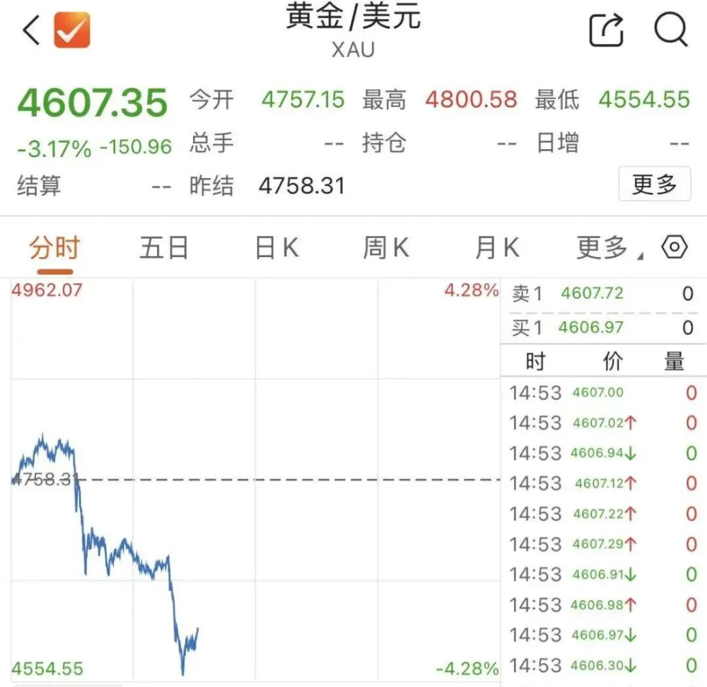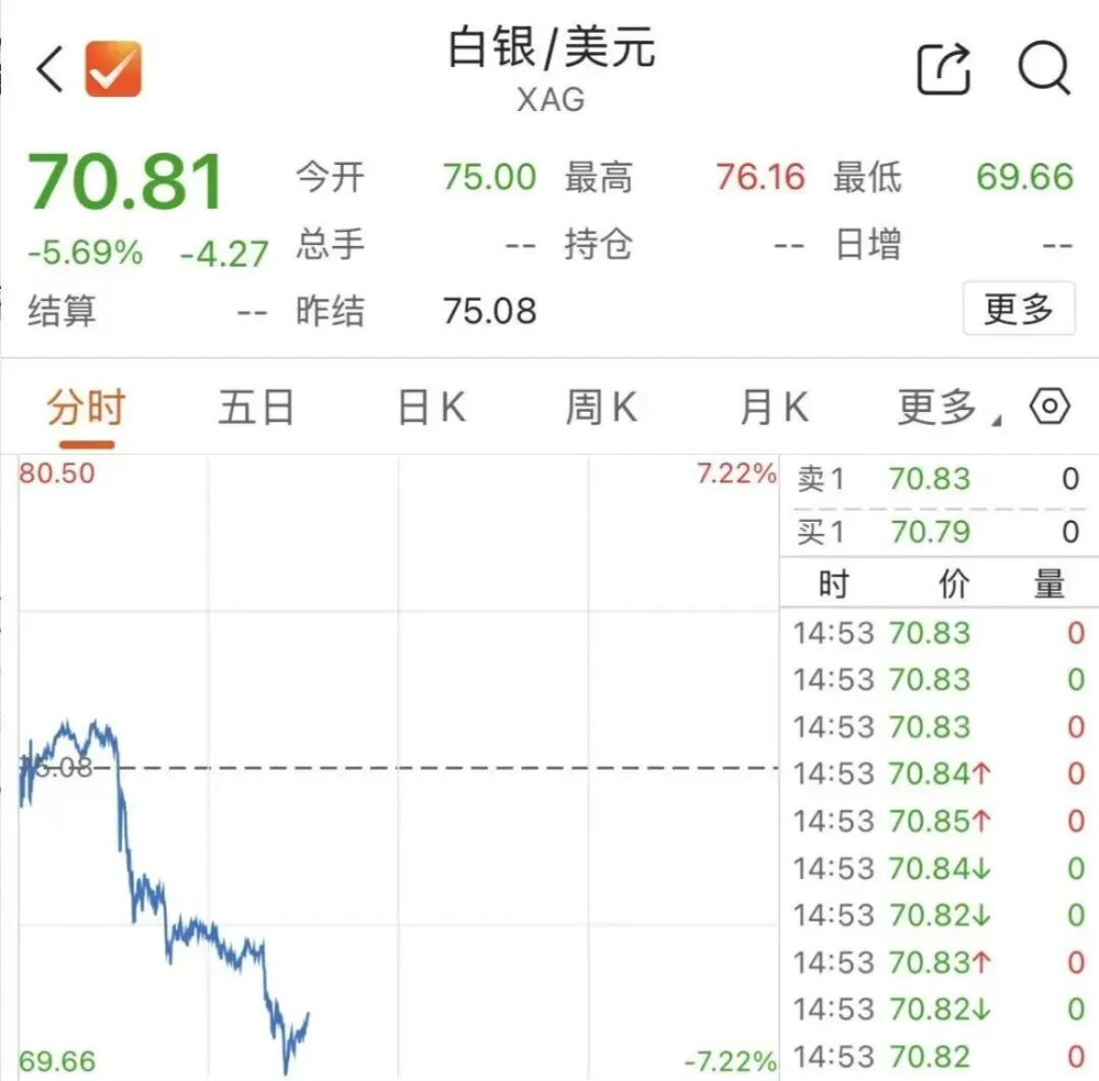 黄金现货价钱一度跌超4%,跌破4600好意思元/盎司关隘,戒指发稿报4607.35好意思元/盎司,下降3.17%。白银现货价钱一度跌超7%,跌破70好意思元/盎司关隘,戒指发稿报70.81好意思元/盎司。