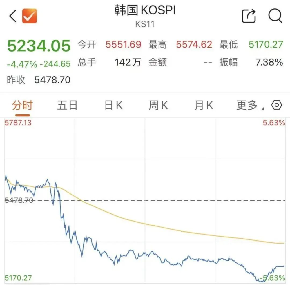 4月2日午后,日韩股市突发跳水。韩国KOSPI指数一度下挫至跌幅超5.6%,收盘跌幅4.47%,报5234.05点。KOSPI 200期货盘中下降5%后,触发KOSPI指数熔断机制,法度化往来暂停5分钟。