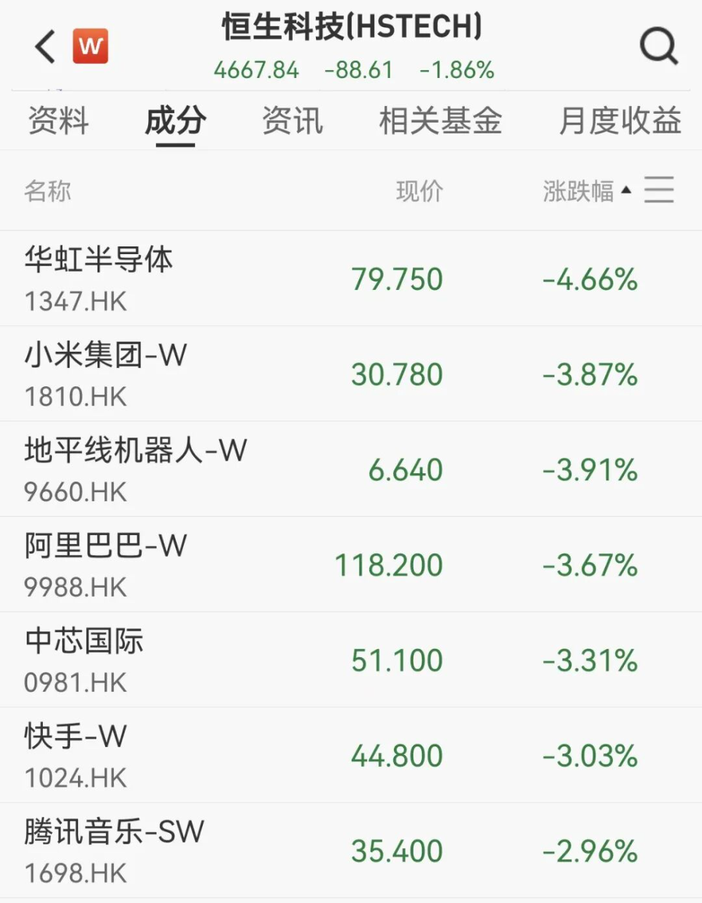 港股低开低走,恒指、恒科指双双跌超1%,恒指一度跌破25000点,科网股大跳水,恒生科技指数跌幅1.86%,AI愚弄股大幅鬈曲,智谱跌近15%,权重科技股全线下降,其中华虹半导体跌超4%,小米跌近4%,阿里巴巴、好意思团跌超3%。