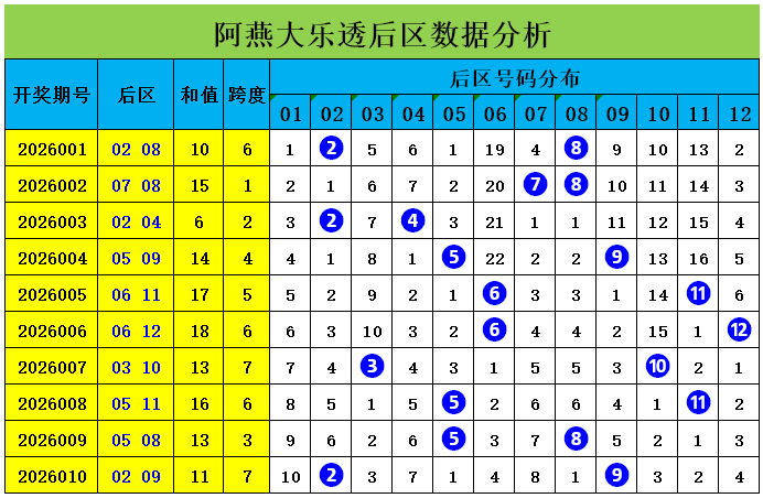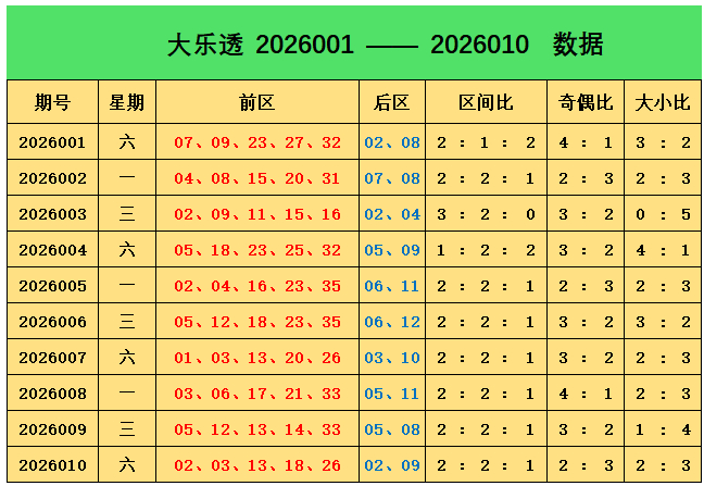 上期回顾:大乐透第2026010期奖号为:前区02、03、13、18、26,后区02、09,前区奖号三区比为2:2:1,奇偶比为2:3,大小比为2:3,后区开出小大组合02、09