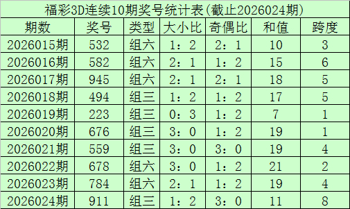 开奖回顾:福利彩票3D第26024期奖号开出911。奖号类型为组三,奇偶形态为奇奇奇,大小形态为大小小。