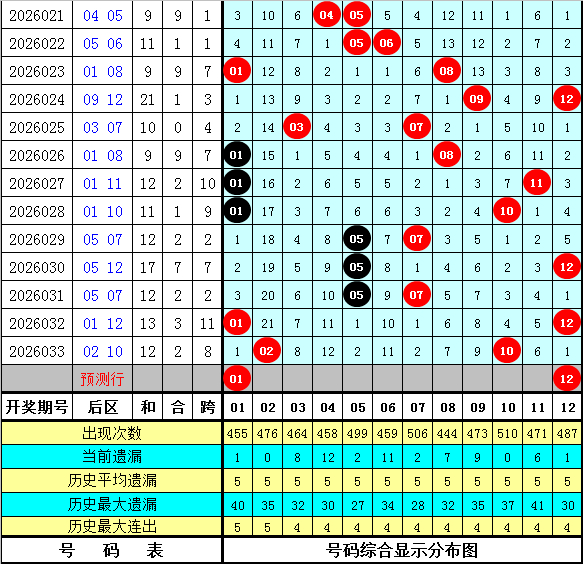 后区判断:上期后区奖号为02和10,开出冷码+温码组合。最近十期后区开出11个热码、6个温码和3个冷码,本期瞻望奖号顺心热码+热码组合,参考两码01、12。