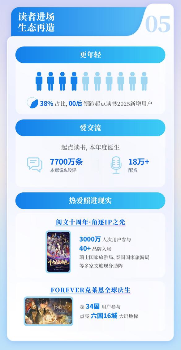 从读者端看,2025年最先念书新增用户中,00后占比达38%,成为最大群体。年青的用户起火意于阅读,而是深度融入彀文IP生态诞生、推行传播与互动共创的全过程。数据显现,最先念书2025出生了7700万条“本章说”与段评、超18万条作品配音。从普通的互动,到“阅文十周年·角逐IP之光”的3000万东说念主次参与,再到“FOREVER克莱恩全球庆生”遮掩34国用户、点亮六国16城大屏地标,正规配资平台读者已成IP生态的深度共创主体。
