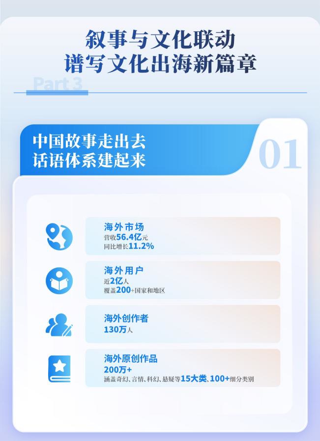 从数据角度,国外原创生态正赓续壮大:全球原土创作者戎行达130万东说念主,国外原创作品超200万部,涵盖魔幻、言情、科幻、悬疑等15大类、100余个细分类别。国外阛阓营收达56.4亿元,同比增长11.2%,国外活跃用户近2亿东说念主,遮掩200多个国度和地区。