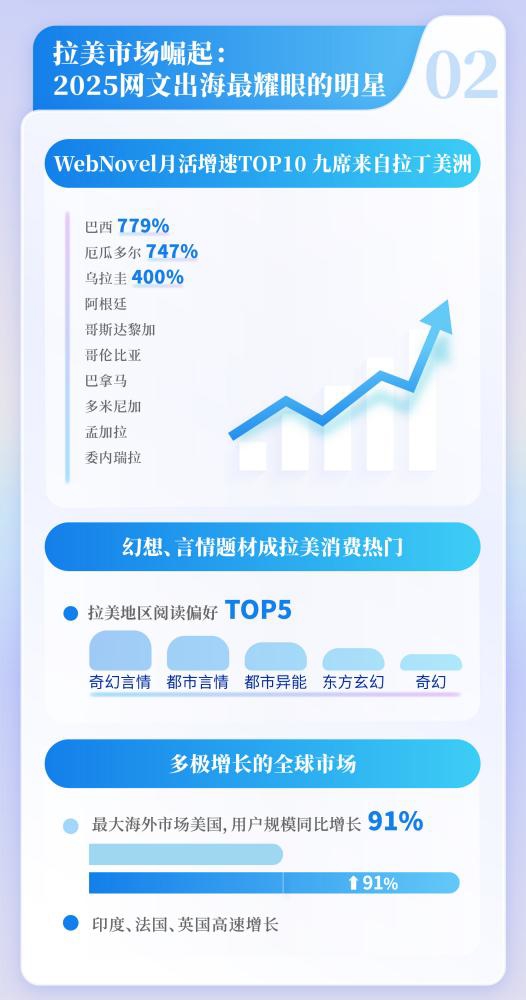 而“2025年网文出海最属想法明星”,无疑是拉好意思阛阓的崛起,在WebNovel(最先国际)全球月活用户增速前十名的国度中,有九个席位被拉好意思国度占据。其中,巴西阛阓以月活779%的增速领跑,其用户打听量也跃升了五位,最终和好意思国、印度包揽了全球前三。