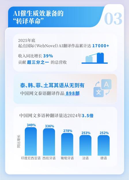 陪伴世界性阛阓的造成,AI翻译的控制也”催生了一场质效兼备的“转译转变”。斥逐2025年底,仅最先国际(WebNovel)一家平台,累计AI翻译作品总额超17000部,收入同比增长39%,孝顺了平台超三分之一的总营收。
