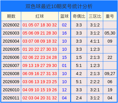 开奖回顾:双色球第2026011期奖号:02、03、04、20、31、32+04。其中奇偶比为2:4,三区比为3:1:2,开出1枚重号04。