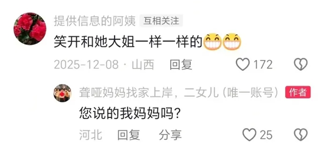 日子就这样被简直枯燥的恭候障翳,一晃四十年。直到2025年秋天,一个普通的日子,三男儿李婷在抖音上看到杨妞花帮一位山东聋哑大姨找家的故事。三年前,杨妞花发在抖音的寻亲视频被堂妹刷到,她的奔波终于画下句号。而后,她从受助者成为助东谈主者,照旧在抖音促成了好几次团圆。视频里,杨妞花用手语和聋哑大姨交流,号召人人的关注。在那之后不久,大姨的亲东谈主果真刷到了杨妞花的视频,一家东谈主奏效皆集。