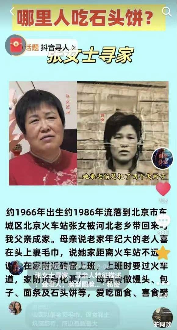 抖音寻东谈主志愿者“安谧快慰”为颉巧芳发布的寻亲视频